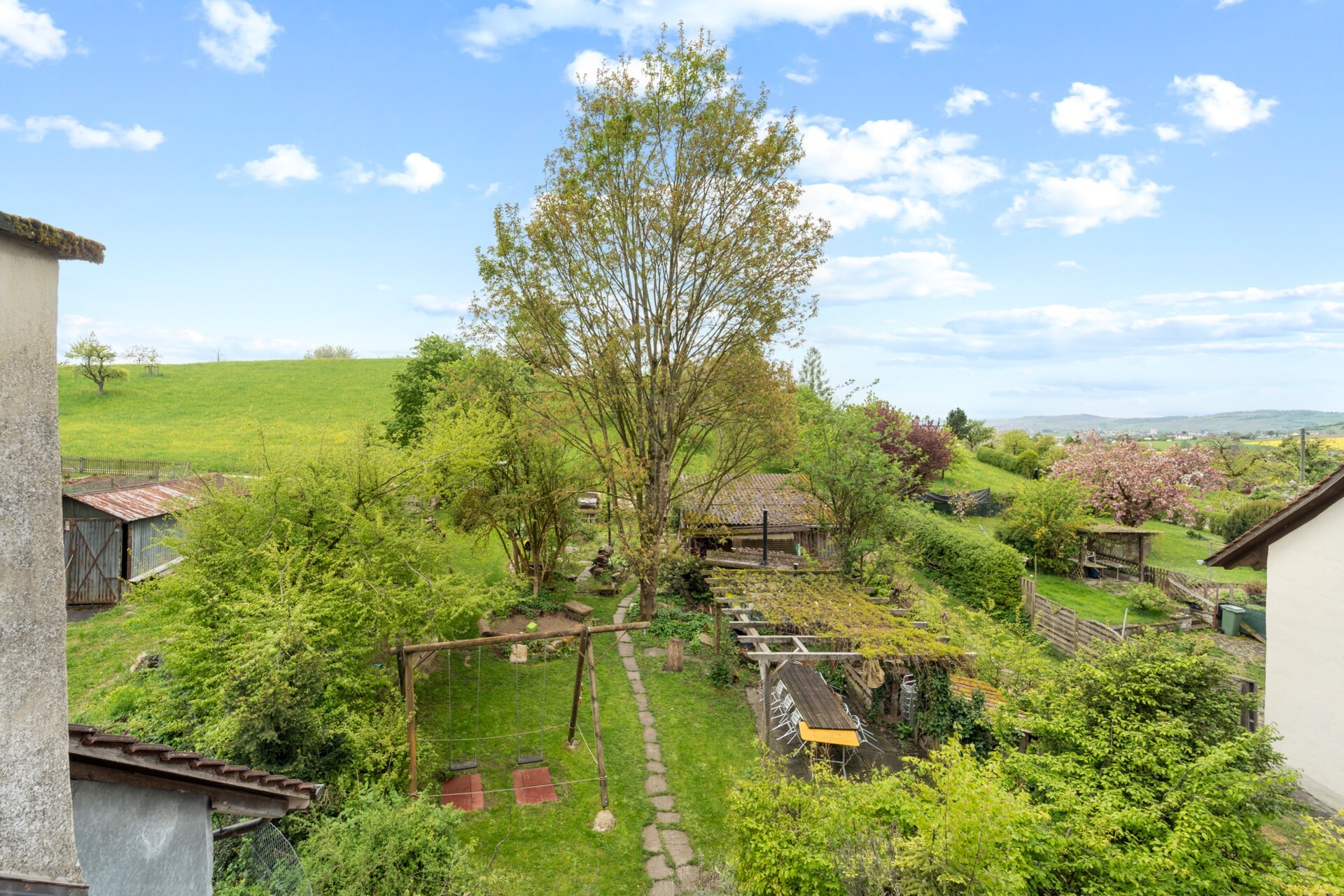 Dazu trägt auch der südseitige ehemalige Ökonomieteil im Süden des Gebäudes bei, welcher zu einer bezaubernden Terrassen- und Laubenlandschaft transformiert wurde. Im grosszügigen Südgarten finden die verschiedenen Bewohner zwischen Schatten spendenden Laubbäumen, Fahrrad-Schopf, Fahrzeug-Unterstand/Werkstatt und Kleinbauten wunderbare Entspannungszonen.